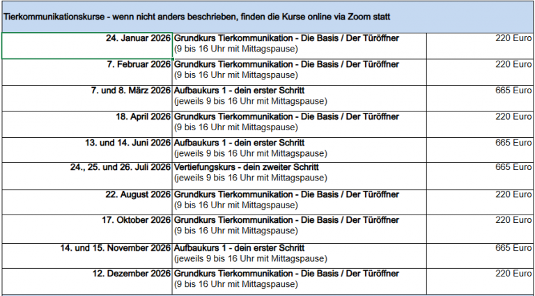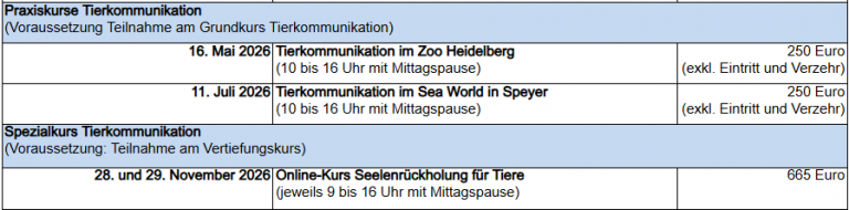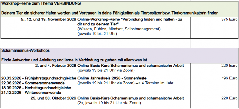 Mehr Details zu den Kursen und Workshops findest du unter Schamanismus sowie unter Tierkommunikation auf meiner Internetseite.