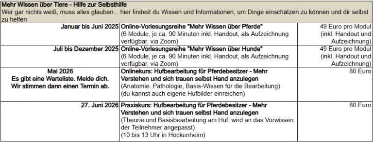 – der nächste Supervisionskurs (Theorie und Praxis) findet am 27. Juni 2026 statt – für den Termin gibt es eine Warteliste, bitte anfragen (Voraussetzung ist Grundwissen über den Huf (Anatomie, Hufformen, Werkzeuge, usw.), dieses kann ich dir gerne als Vorlesungsmodul via Zoom zur Verfügung stellen – 80 Euro, ca. 2 h Informationen).